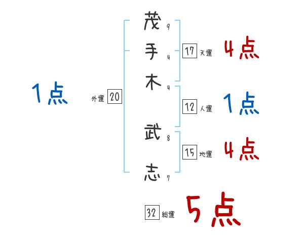 総運![]() | 茂手木武志さんの総運は32画の5つ星!柔軟性があり成功する。チャンスが多く金運が良い。 あなたの人生を表す1番重要な運勢です。生涯を通じて影響する総合運となり、主に50歳以降の晩年期に影響を及ぼします。 |