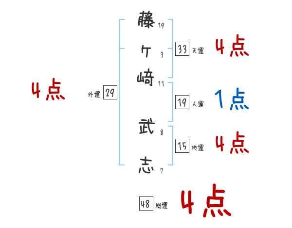 天運![]() | 藤ヶ﨑武志さんの天運は33画の4つ星!権力志向でプライドが高い。勇気があり運を切り開き成功する。 家系が持つ宿命的な運勢を表します。祖先から受け継いだ苗字ですので自分の力が及びません。家柄を象徴します。 |
