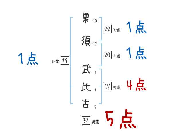 外運![]() | 栗須武比古さんの外運は19画の1つ星!優れた才能を持ちますが、協調性が足りないことも。周りの人と協力する事を意識しましょう。 生活面を象徴する運勢です。外部から受ける影響力を表し、結婚運、家庭運や職場、環境への順応性を表します。 |