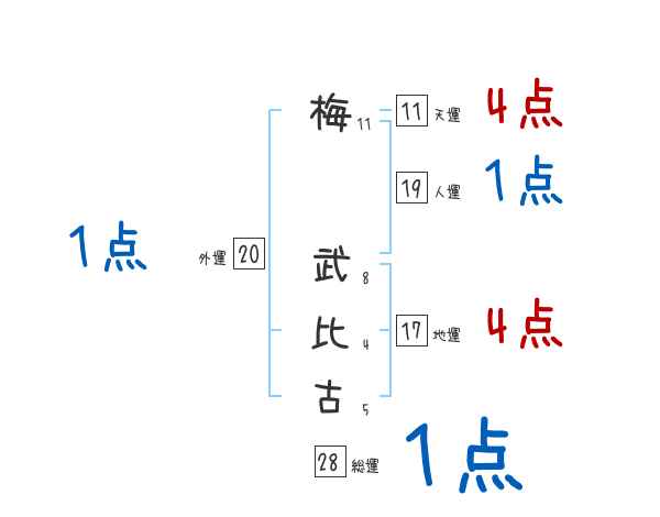 天運![]() | 梅武比古さんの天運は11画の4つ星!着実に富や地位を得る幸運な人生。 家系が持つ宿命的な運勢を表します。祖先から受け継いだ苗字ですので自分の力が及びません。家柄を象徴します。 |