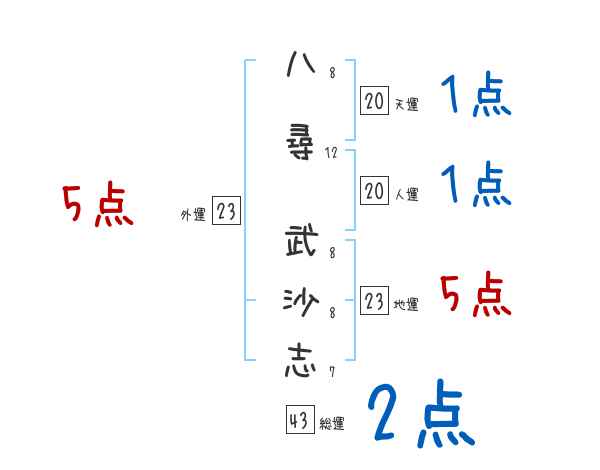 外運![]() | 八尋武沙志さんの外運は23画の5つ星!想像力に優れ活力がある。一代で成功し名誉を手に入れる。 生活面を象徴する運勢です。外部から受ける影響力を表し、結婚運、家庭運や職場、環境への順応性を表します。 |