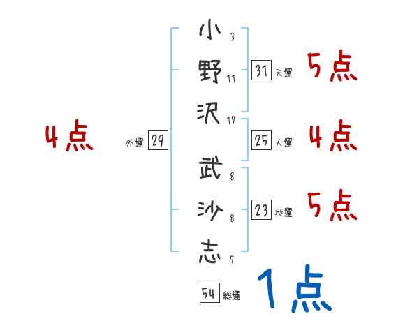 外運![]() | 小野沢武沙志さんの外運は29画の4つ星!完全主義で才能がある。厳格な心の持ち主。 生活面を象徴する運勢です。外部から受ける影響力を表し、結婚運、家庭運や職場、環境への順応性を表します。 |