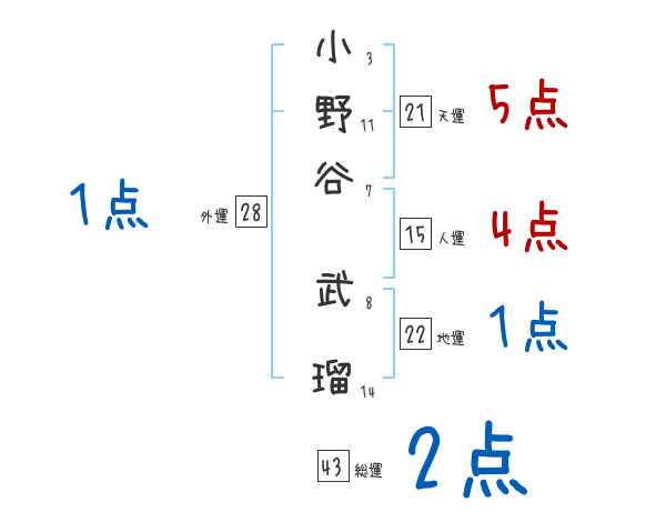 天運![]() | 小野谷武瑠さんの天運は21画の5つ星!統率力がある。独立し成功する。名誉を手に入れる。 家系が持つ宿命的な運勢を表します。祖先から受け継いだ苗字ですので自分の力が及びません。家柄を象徴します。 |