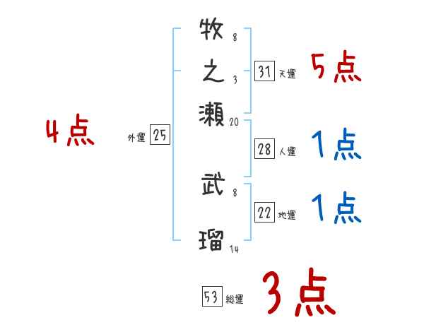 人運![]() | 牧之瀬武瑠さんの人運は28画の1つ星!家庭環境に注意。スポーツで活躍できる能力があるかも。 性格や才能などを表す2番目に重要な運勢です。人間関係や協調性、社会的な成功に影響します。主に20歳から50歳ぐらいまでの中年期の運勢を表します。 |