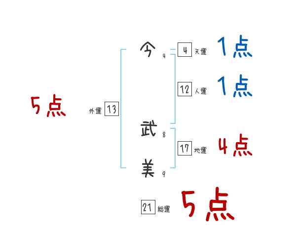 天運![]() | 今武美さんの天運は4画の1つ星!感情が不安定で苦労するかも。周囲との協調を心掛けましょう。 家系が持つ宿命的な運勢を表します。祖先から受け継いだ苗字ですので自分の力が及びません。家柄を象徴します。 |