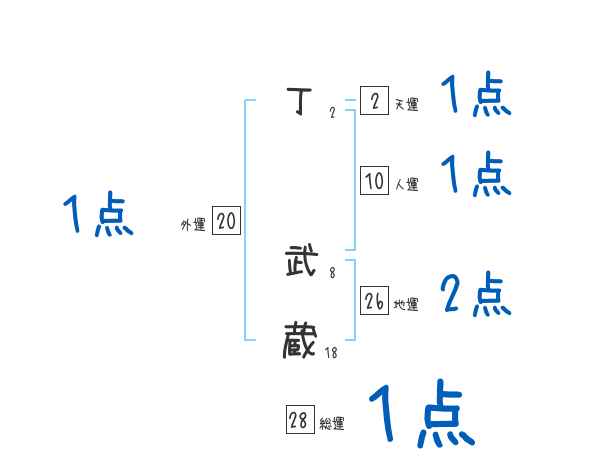天運![]() | 丁武蔵さんの天運は2画の1つ星!優しいですが積極性や意思の強さに欠ける傾向があります。家庭環境の乱れに注意しましょう。 家系が持つ宿命的な運勢を表します。祖先から受け継いだ苗字ですので自分の力が及びません。家柄を象徴します。 |
