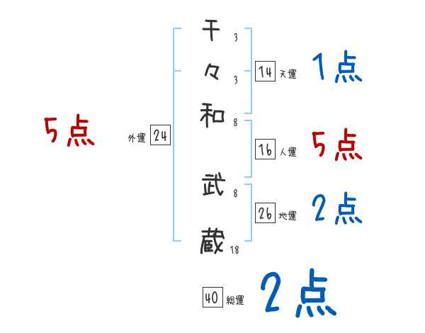 地運![]() | 千々和武蔵さんの地運は26画の2つ星!波瀾万丈かも。信頼できる人を大事にしましょう。 個性を表す基礎的な運勢です。性格形成や対人関係、行動力など家庭環境に影響されます。主に誕生してから20歳くらいまでの若年期の運勢を表します。 |