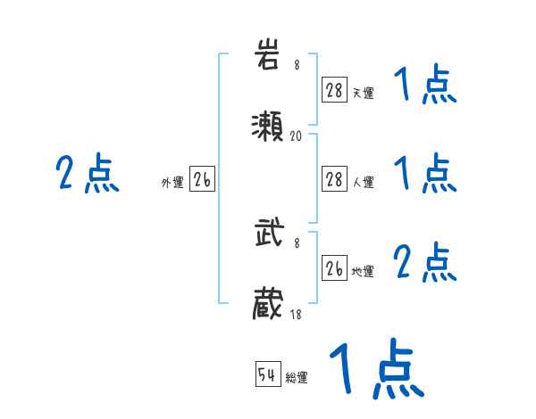 天運![]() | 岩瀬武蔵さんの天運は28画の1つ星!家庭環境に注意。スポーツで活躍できる能力があるかも。 家系が持つ宿命的な運勢を表します。祖先から受け継いだ苗字ですので自分の力が及びません。家柄を象徴します。 |
