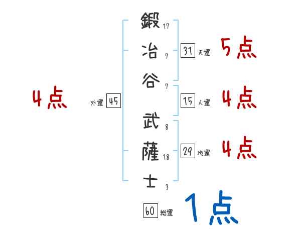 天運![]() | 鍛冶谷武薩士さんの天運は31画の5つ星!社交性があり判断力に優れる。順風満帆な人生で円満な生活。 家系が持つ宿命的な運勢を表します。祖先から受け継いだ苗字ですので自分の力が及びません。家柄を象徴します。 |