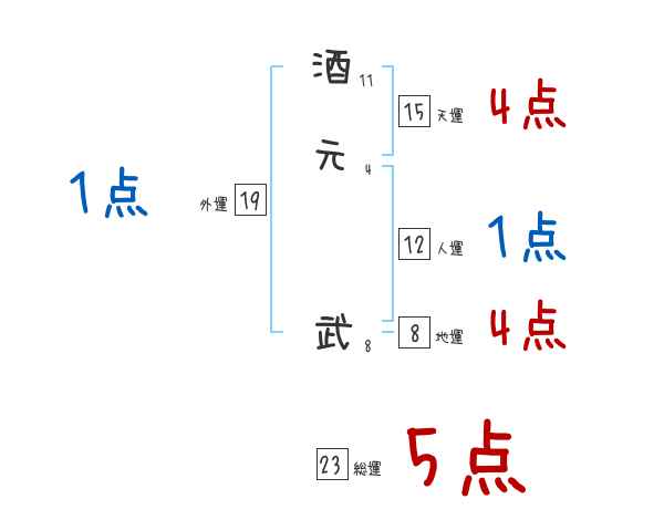 外運![]() | 酒元武さんの外運は19画の1つ星!優れた才能を持ちますが、協調性が足りないことも。周りの人と協力する事を意識しましょう。 生活面を象徴する運勢です。外部から受ける影響力を表し、結婚運、家庭運や職場、環境への順応性を表します。 |