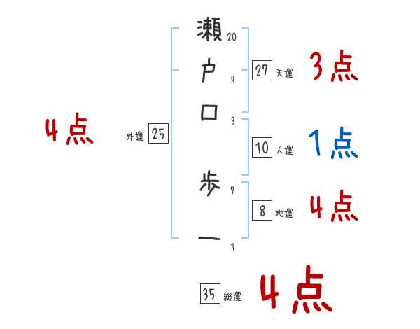 天運![]() | 瀬戸口歩一さんの天運は27画の3つ星!頭脳明晰だが強情で摩擦が多い傾向。孤立に注意。 家系が持つ宿命的な運勢を表します。祖先から受け継いだ苗字ですので自分の力が及びません。家柄を象徴します。 |