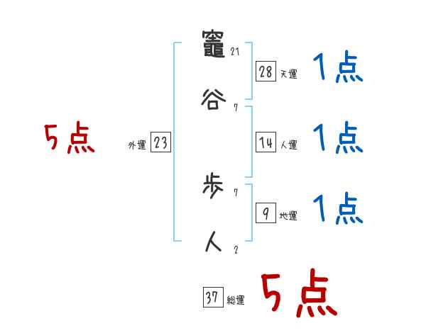 天運![]() | 竈谷歩人さんの天運は28画の1つ星!家庭環境に注意。スポーツで活躍できる能力があるかも。 家系が持つ宿命的な運勢を表します。祖先から受け継いだ苗字ですので自分の力が及びません。家柄を象徴します。 |