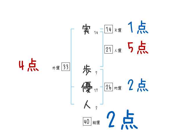 外運![]() | 実歩優人さんの外運は33画の4つ星!権力志向でプライドが高い。勇気があり運を切り開き成功する。 生活面を象徴する運勢です。外部から受ける影響力を表し、結婚運、家庭運や職場、環境への順応性を表します。 |