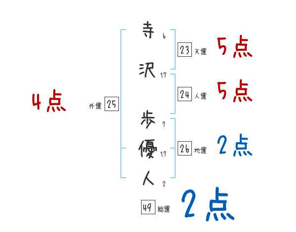 天運![]() | 寺沢歩優人さんの天運は23画の5つ星!想像力に優れ活力がある。一代で成功し名誉を手に入れる。 家系が持つ宿命的な運勢を表します。祖先から受け継いだ苗字ですので自分の力が及びません。家柄を象徴します。 |