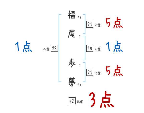 外運![]() | 福尾歩夢さんの外運は28画の1つ星!家庭環境に注意。スポーツで活躍できる能力があるかも。 生活面を象徴する運勢です。外部から受ける影響力を表し、結婚運、家庭運や職場、環境への順応性を表します。 |