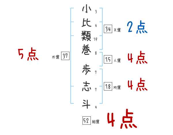 外運![]() | 小比類巻歩志斗さんの外運は37画の5つ星!努力家で順応性に優れる。現実的な考え方ができ忠実に物事をこなす。 生活面を象徴する運勢です。外部から受ける影響力を表し、結婚運、家庭運や職場、環境への順応性を表します。 |
