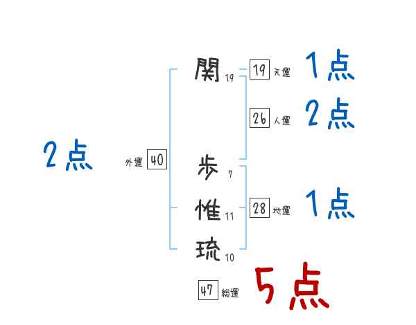 総運![]() | 関歩惟琉さんの総運は47画の5つ星!実力が開花し発展する円満な人生。財に恵まれる。 あなたの人生を表す1番重要な運勢です。生涯を通じて影響する総合運となり、主に50歳以降の晩年期に影響を及ぼします。 |
