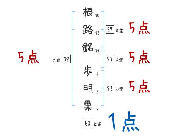 人運![]() | 根路銘歩明果さんの人運は21画の5つ星!統率力がある。独立し成功する。名誉を手に入れる。 性格や才能などを表す2番目に重要な運勢です。人間関係や協調性、社会的な成功に影響します。主に20歳から50歳ぐらいまでの中年期の運勢を表します。 |