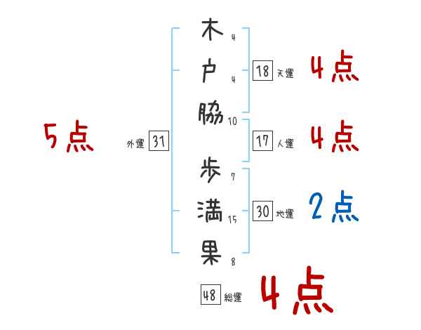 外運![]() | 木戸脇歩満果さんの外運は31画の5つ星!社交性があり判断力に優れる。順風満帆な人生で円満な生活。 生活面を象徴する運勢です。外部から受ける影響力を表し、結婚運、家庭運や職場、環境への順応性を表します。 |