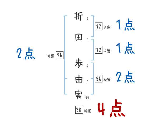 総運![]() | 折田歩由実さんの総運は38画の4つ星!温厚な性格で技術的な才能を発揮する。職人的な仕事に向いている。 あなたの人生を表す1番重要な運勢です。生涯を通じて影響する総合運となり、主に50歳以降の晩年期に影響を及ぼします。 |