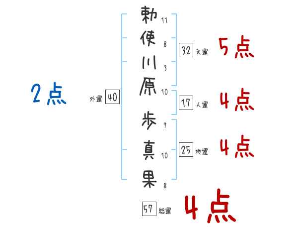 天運![]() | 勅使川原歩真果さんの天運は32画の5つ星!柔軟性があり成功する。チャンスが多く金運が良い。 家系が持つ宿命的な運勢を表します。祖先から受け継いだ苗字ですので自分の力が及びません。家柄を象徴します。 |