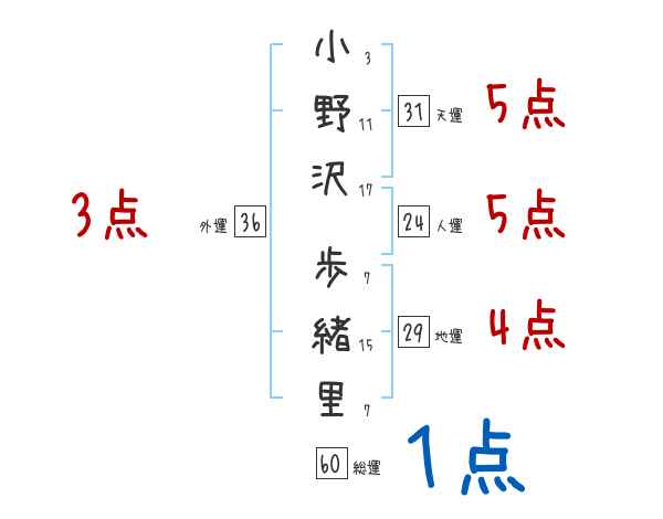 外運![]() | 小野沢歩緒里さんの外運は36画の3つ星!先見性が豊かです。多少神経質で苦労することも。 生活面を象徴する運勢です。外部から受ける影響力を表し、結婚運、家庭運や職場、環境への順応性を表します。 |