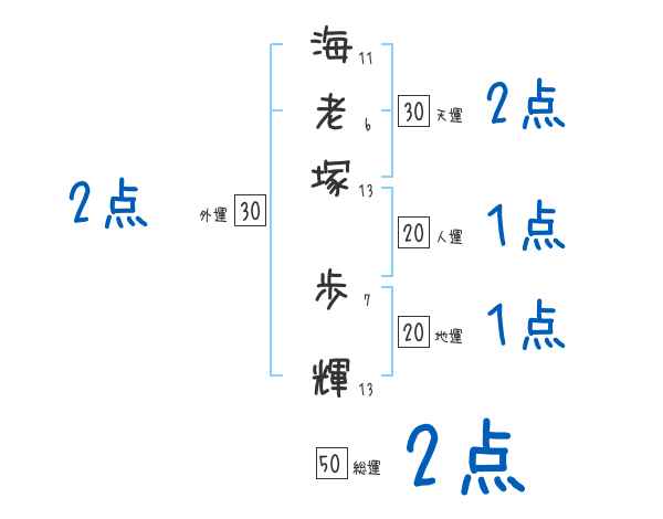 天運![]() | 海老塚歩輝さんの天運は30画の2つ星!浮き沈みの激しさに注意しましょう。 家系が持つ宿命的な運勢を表します。祖先から受け継いだ苗字ですので自分の力が及びません。家柄を象徴します。 |