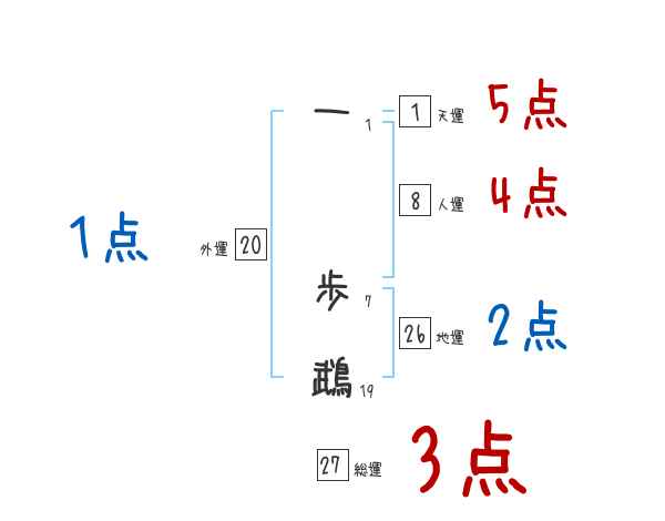 天運![]() | 一歩鵡さんの天運は1画の5つ星!行動力、指導力があり出世し繁栄する。幸運に恵まれる。 家系が持つ宿命的な運勢を表します。祖先から受け継いだ苗字ですので自分の力が及びません。家柄を象徴します。 |
