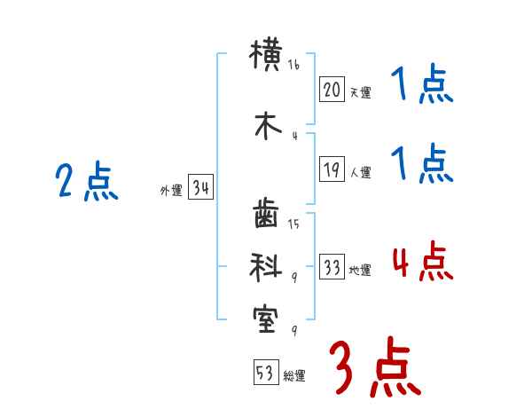 総運![]() | 横木歯科室さんの総運は53画の3つ星!やや見栄っ張りで虚栄心がある。散財に注意。 あなたの人生を表す1番重要な運勢です。生涯を通じて影響する総合運となり、主に50歳以降の晩年期に影響を及ぼします。 |