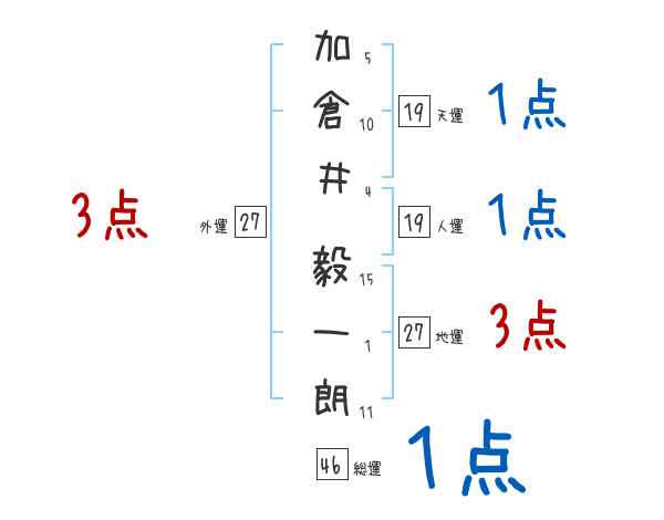 地運![]() | 加倉井毅一朗さんの地運は27画の3つ星!頭脳明晰だが強情で摩擦が多い傾向。孤立に注意。 個性を表す基礎的な運勢です。性格形成や対人関係、行動力など家庭環境に影響されます。主に誕生してから20歳くらいまでの若年期の運勢を表します。 |
