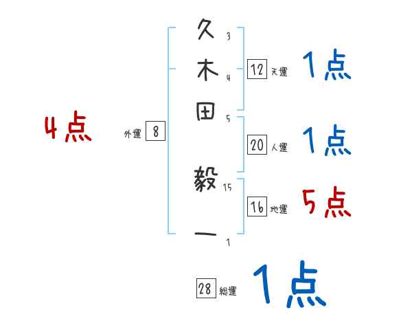天運![]() | 久木田毅一さんの天運は12画の1つ星!簡単な失敗で諦めてしまいやすいかも。着実に行動すると良いでしょう。 家系が持つ宿命的な運勢を表します。祖先から受け継いだ苗字ですので自分の力が及びません。家柄を象徴します。 |
