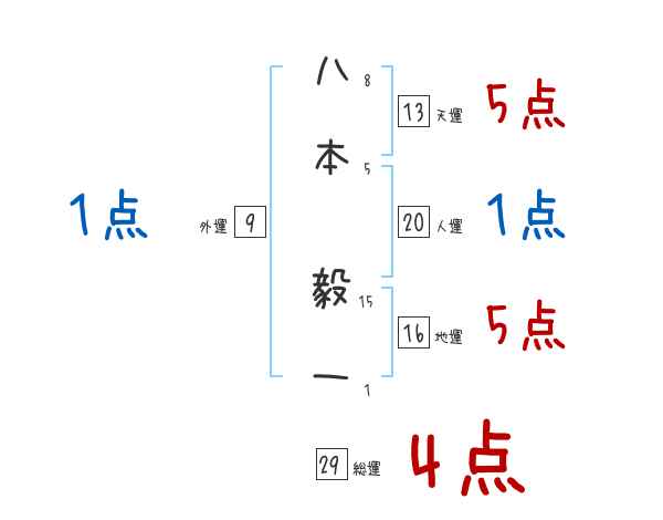 総運![]() | 八本毅一さんの総運は29画の4つ星!完全主義で才能がある。厳格な心の持ち主。 あなたの人生を表す1番重要な運勢です。生涯を通じて影響する総合運となり、主に50歳以降の晩年期に影響を及ぼします。 |