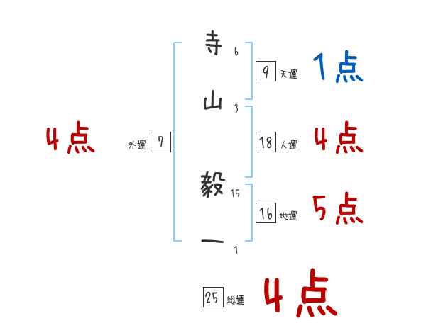 天運![]() | 寺山毅一さんの天運は9画の1つ星!消極的で才能を発揮することが苦手なことも。周りの意見に耳を傾けましょう。 家系が持つ宿命的な運勢を表します。祖先から受け継いだ苗字ですので自分の力が及びません。家柄を象徴します。 |