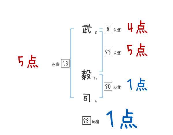 人運![]() | 武毅司さんの人運は23画の5つ星!想像力に優れ活力がある。一代で成功し名誉を手に入れる。 性格や才能などを表す2番目に重要な運勢です。人間関係や協調性、社会的な成功に影響します。主に20歳から50歳ぐらいまでの中年期の運勢を表します。 |