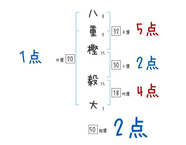 天運![]() | 八重樫毅大さんの天運は32画の5つ星!柔軟性があり成功する。チャンスが多く金運が良い。 家系が持つ宿命的な運勢を表します。祖先から受け継いだ苗字ですので自分の力が及びません。家柄を象徴します。 |