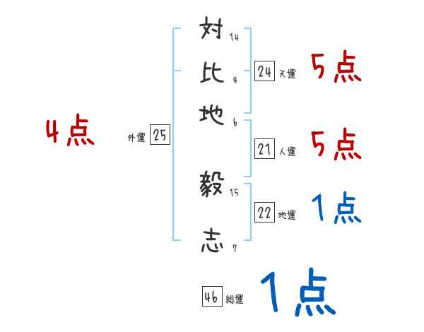 人運![]() | 対比地毅志さんの人運は21画の5つ星!統率力がある。独立し成功する。名誉を手に入れる。 性格や才能などを表す2番目に重要な運勢です。人間関係や協調性、社会的な成功に影響します。主に20歳から50歳ぐらいまでの中年期の運勢を表します。 |