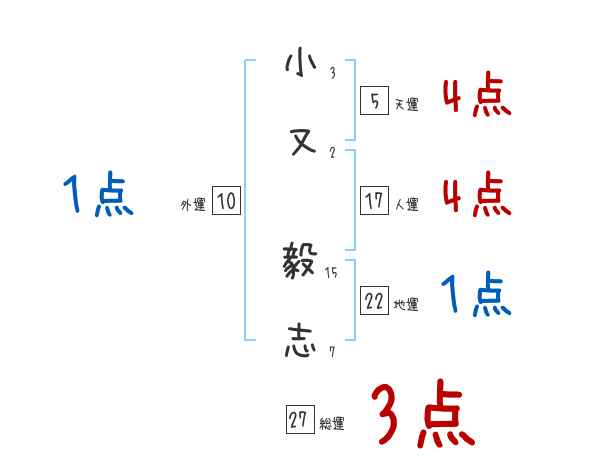 天運![]() | 小又毅志さんの天運は5画の4つ星!健康で安泰。協調性に優れ、財産に恵まれる。 家系が持つ宿命的な運勢を表します。祖先から受け継いだ苗字ですので自分の力が及びません。家柄を象徴します。 |