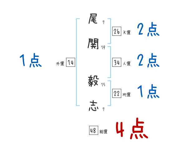 外運![]() | 尾関毅志さんの外運は14画の1つ星!人に対して優しいがストレスを溜め込みがち。人間関係のトラブルを避けるよう気をつけましょう。 生活面を象徴する運勢です。外部から受ける影響力を表し、結婚運、家庭運や職場、環境への順応性を表します。 |
