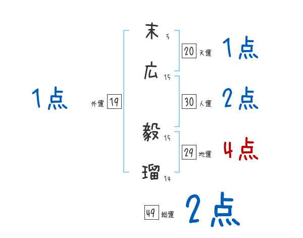 外運![]() | 末広毅瑠さんの外運は19画の1つ星!優れた才能を持ちますが、協調性が足りないことも。周りの人と協力する事を意識しましょう。 生活面を象徴する運勢です。外部から受ける影響力を表し、結婚運、家庭運や職場、環境への順応性を表します。 |