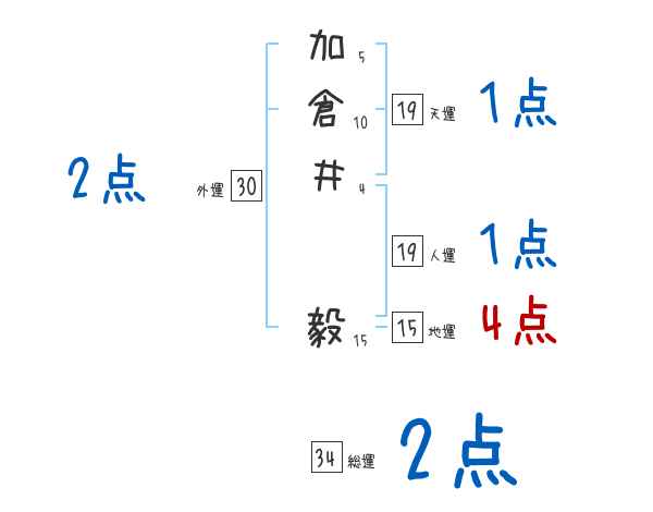 総運![]() | 加倉井毅さんの総運は34画の2つ星!独創性に優れるが、自尊心が強く災難に注意しましょう。 あなたの人生を表す1番重要な運勢です。生涯を通じて影響する総合運となり、主に50歳以降の晩年期に影響を及ぼします。 |