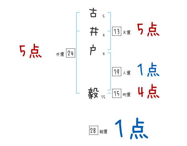 人運![]() | 古井戸毅さんの人運は19画の1つ星!優れた才能を持ちますが、協調性が足りないことも。周りの人と協力する事を意識しましょう。 性格や才能などを表す2番目に重要な運勢です。人間関係や協調性、社会的な成功に影響します。主に20歳から50歳ぐらいまでの中年期の運勢を表します。 |