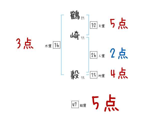 総運![]() | 鶴崎毅さんの総運は47画の5つ星!実力が開花し発展する円満な人生。財に恵まれる。 あなたの人生を表す1番重要な運勢です。生涯を通じて影響する総合運となり、主に50歳以降の晩年期に影響を及ぼします。 |