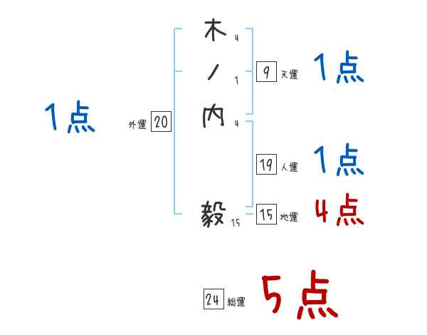 天運![]() | 木ノ内毅さんの天運は9画の1つ星!消極的で才能を発揮することが苦手なことも。周りの意見に耳を傾けましょう。 家系が持つ宿命的な運勢を表します。祖先から受け継いだ苗字ですので自分の力が及びません。家柄を象徴します。 |