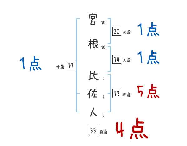 外運![]() | 宮根比佐人さんの外運は19画の1つ星!優れた才能を持ちますが、協調性が足りないことも。周りの人と協力する事を意識しましょう。 生活面を象徴する運勢です。外部から受ける影響力を表し、結婚運、家庭運や職場、環境への順応性を表します。 |