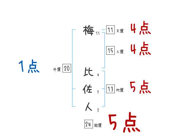 天運![]() | 梅比佐人さんの天運は11画の4つ星!着実に富や地位を得る幸運な人生。 家系が持つ宿命的な運勢を表します。祖先から受け継いだ苗字ですので自分の力が及びません。家柄を象徴します。 |