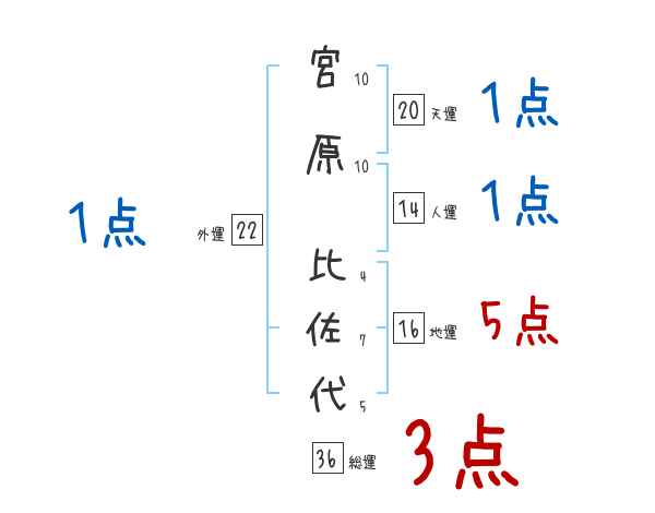 外運![]() | 宮原比佐代さんの外運は22画の1つ星!努力することが苦手ないっぽう手先が器用。芸術性にも優れる。 生活面を象徴する運勢です。外部から受ける影響力を表し、結婚運、家庭運や職場、環境への順応性を表します。 |