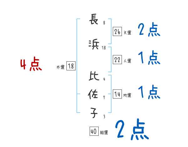 人運![]() | 長浜比佐子さんの人運は22画の1つ星!努力することが苦手ないっぽう手先が器用。芸術性にも優れる。 性格や才能などを表す2番目に重要な運勢です。人間関係や協調性、社会的な成功に影響します。主に20歳から50歳ぐらいまでの中年期の運勢を表します。 |