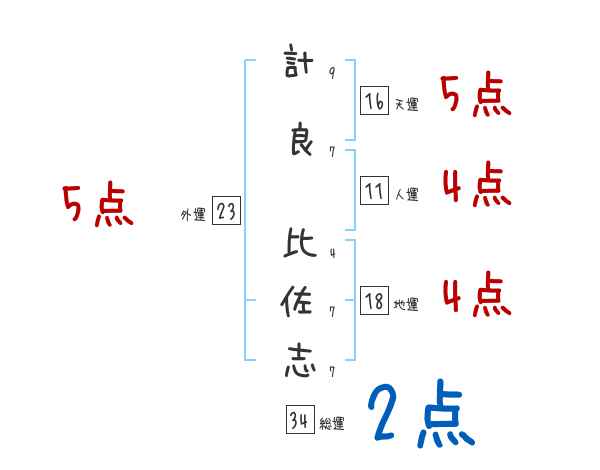 総運![]() | 計良比佐志さんの総運は34画の2つ星!独創性に優れるが、自尊心が強く災難に注意しましょう。 あなたの人生を表す1番重要な運勢です。生涯を通じて影響する総合運となり、主に50歳以降の晩年期に影響を及ぼします。 |