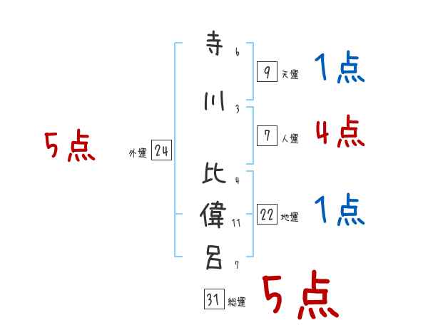 外運![]() | 寺川比偉呂さんの外運は24画の5つ星!家庭運が良く順調な人生。金運にも恵まれる。 生活面を象徴する運勢です。外部から受ける影響力を表し、結婚運、家庭運や職場、環境への順応性を表します。 |