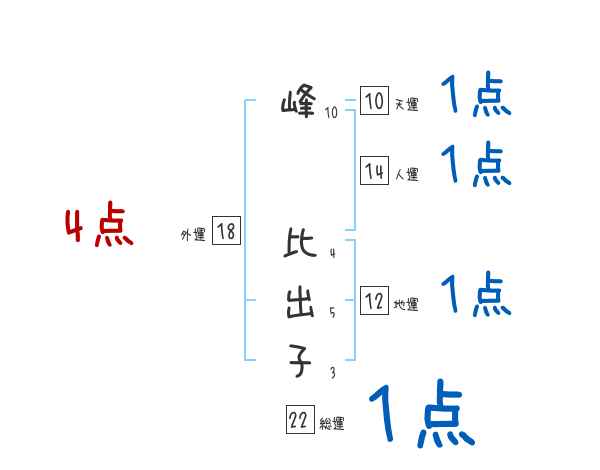天運![]() | 峰比出子さんの天運は10画の1つ星!不安を感じやすい傾向。ストレスを抱えないように注意しましょう。 家系が持つ宿命的な運勢を表します。祖先から受け継いだ苗字ですので自分の力が及びません。家柄を象徴します。 |